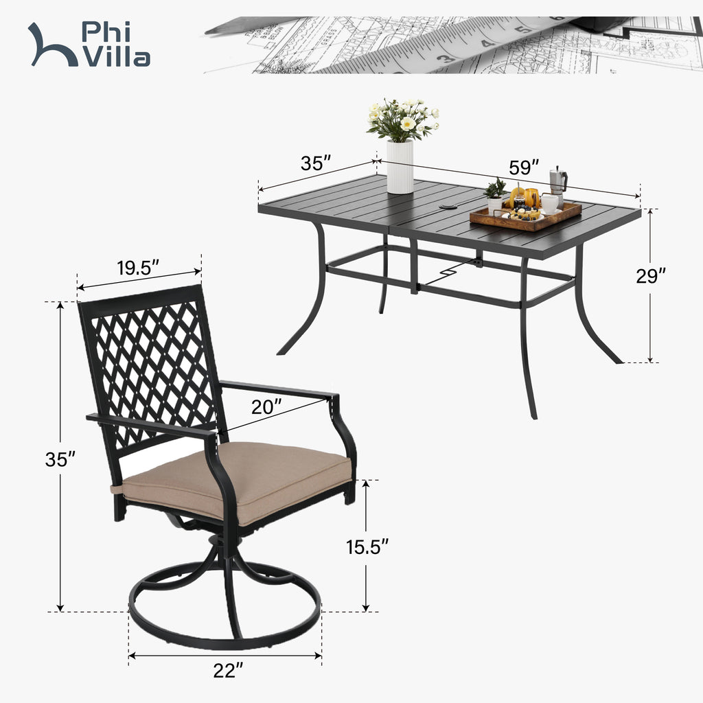 PHI VILLA 7-Piece Outdoor Patio Dining Set With Steel Panel Table and 6 Swivel Chairs