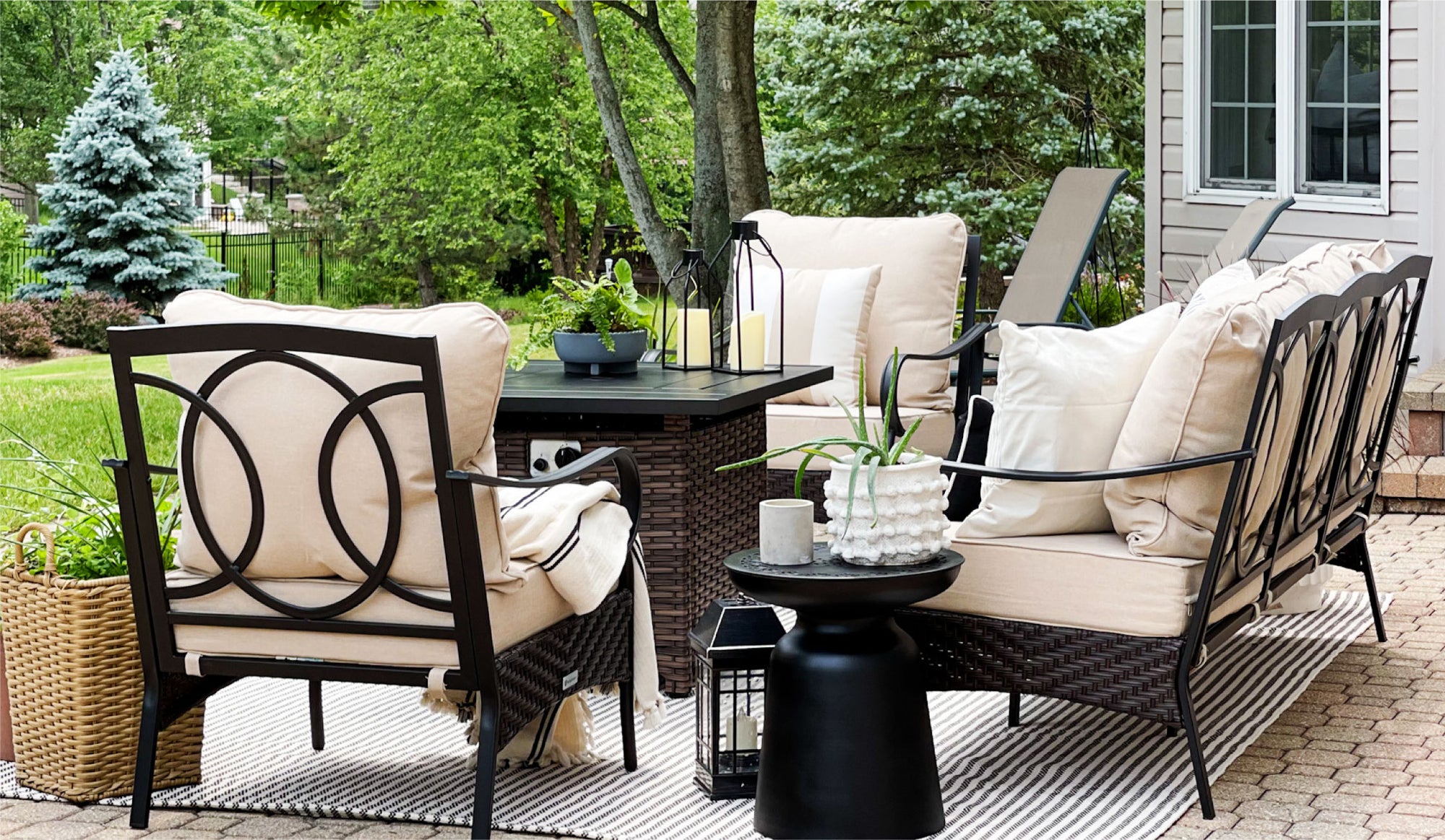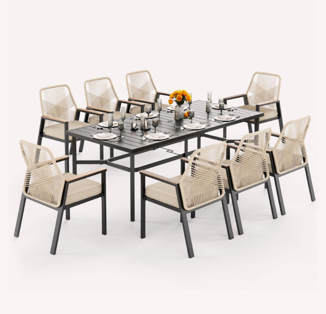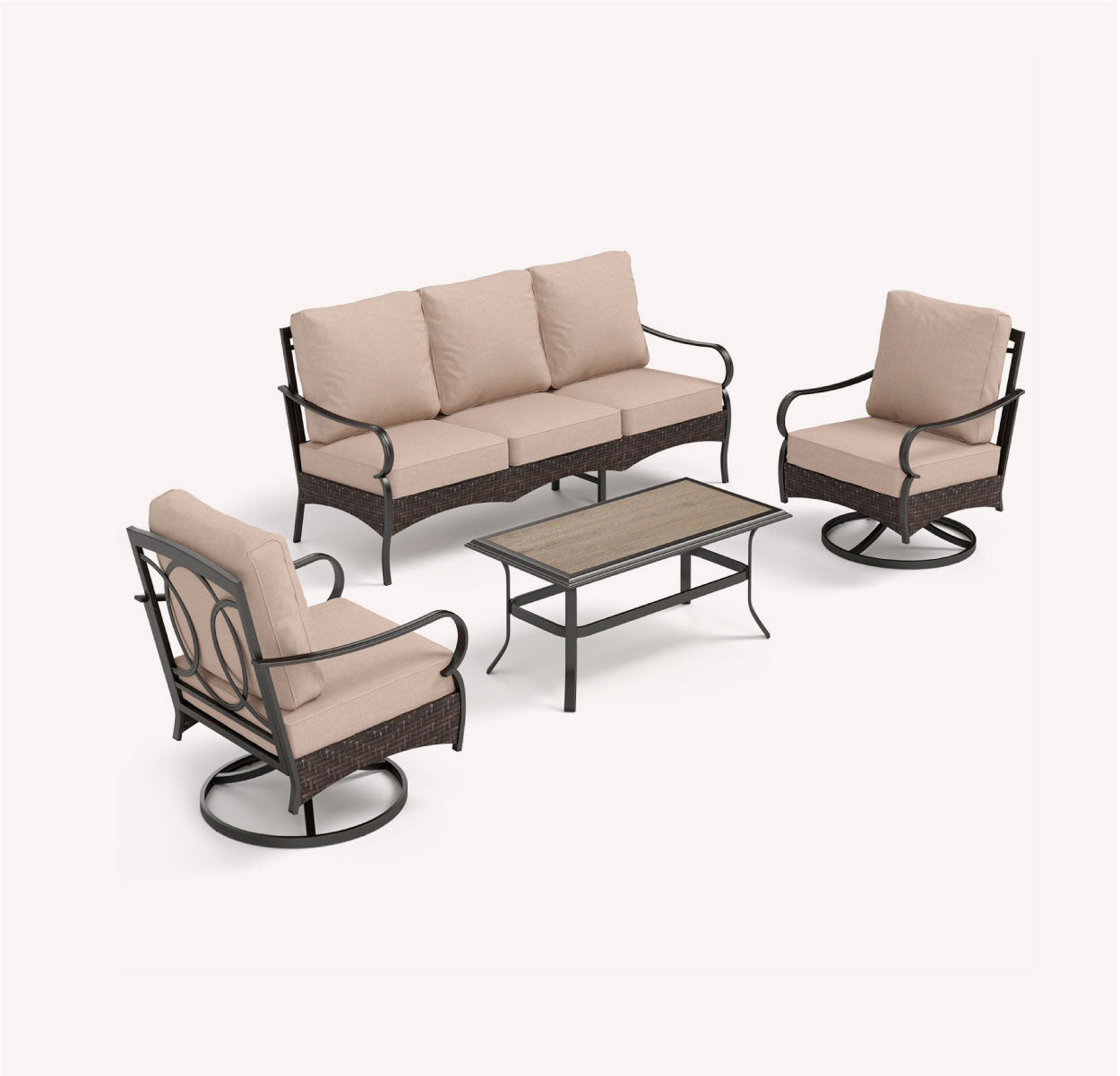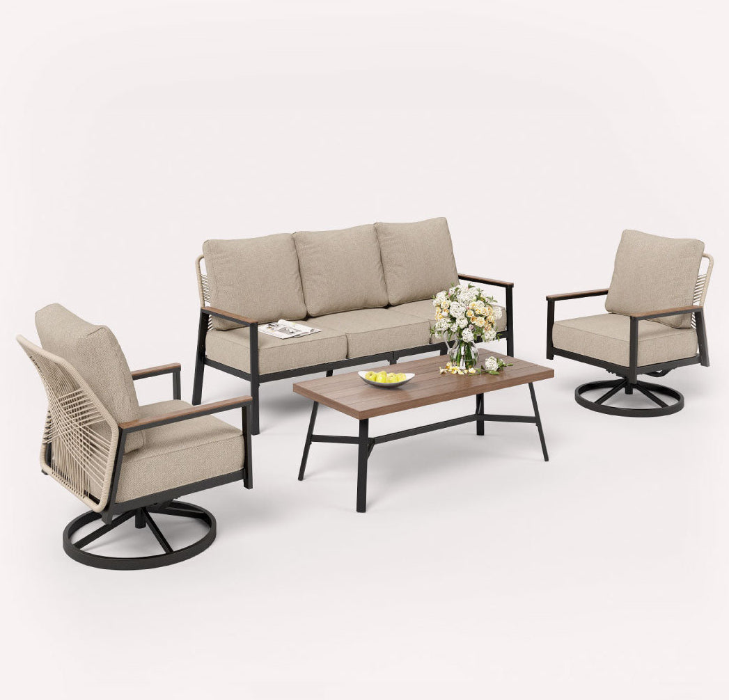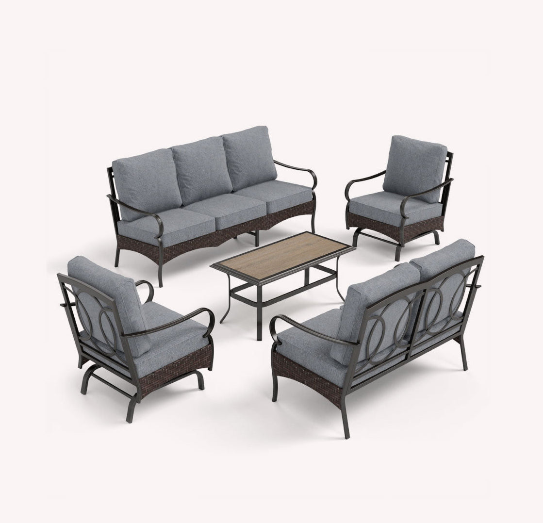 This features a sleek metal frame paired with rustic brown rattan, merging modern design with natural warmth, perfect for stylish and comfortable outdoor living experiences.