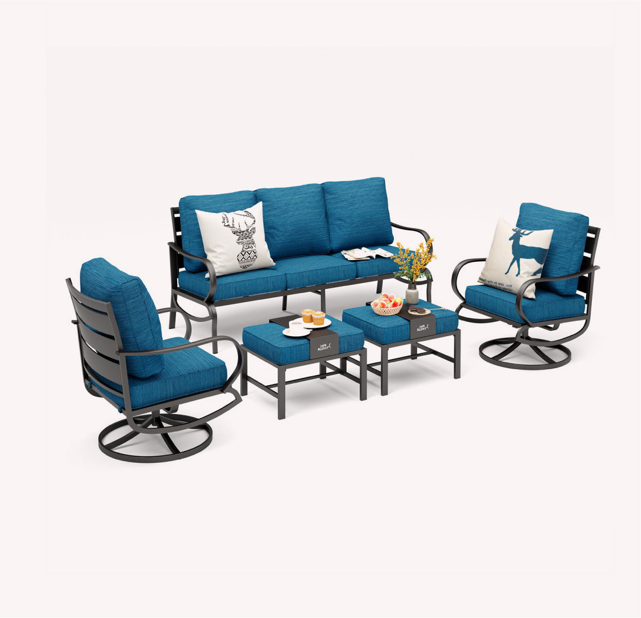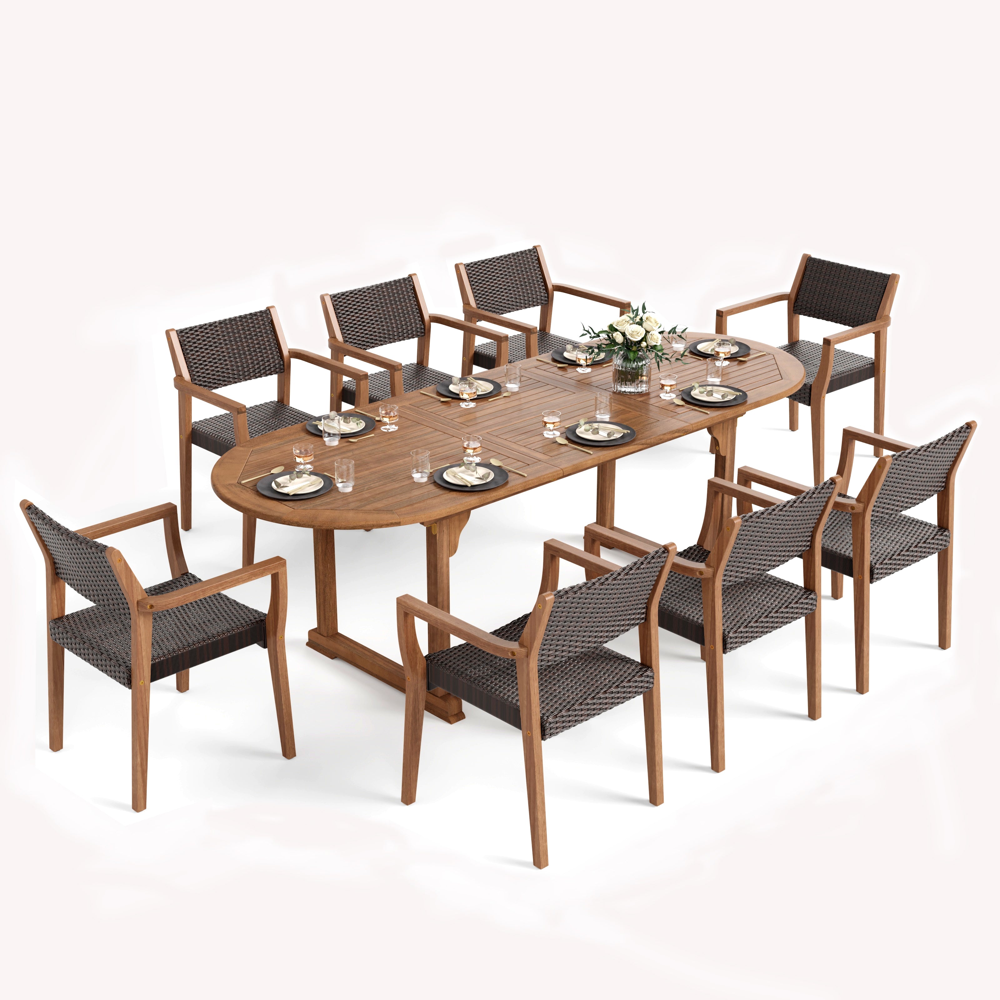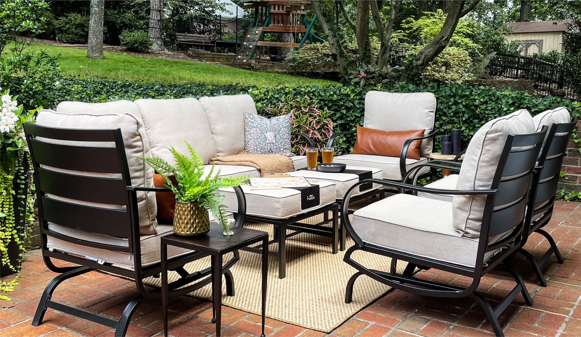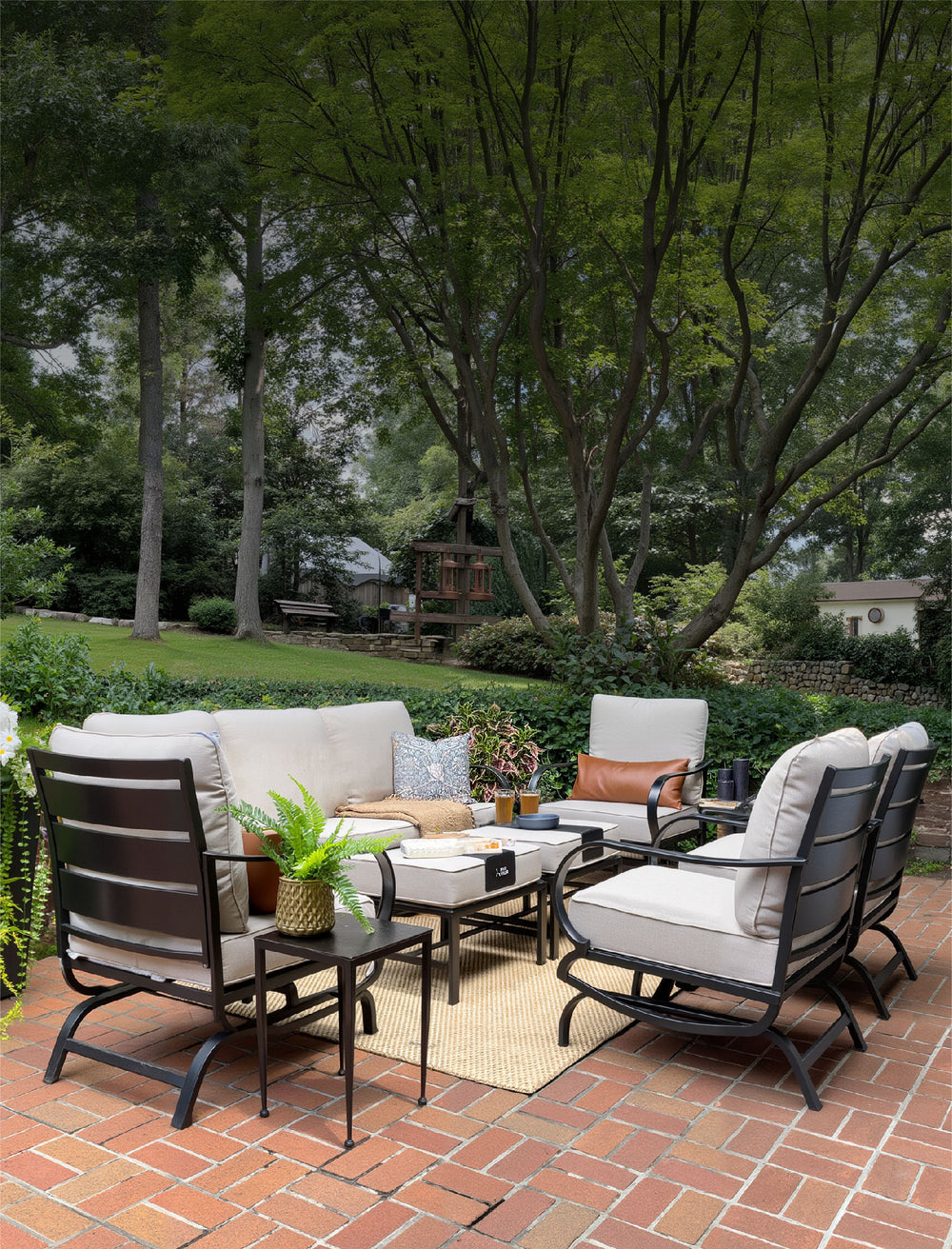 This features a sleek metal frame paired with rustic brown rattan, merging modern design with natural warmth, perfect for stylish and comfortable outdoor living experiences.