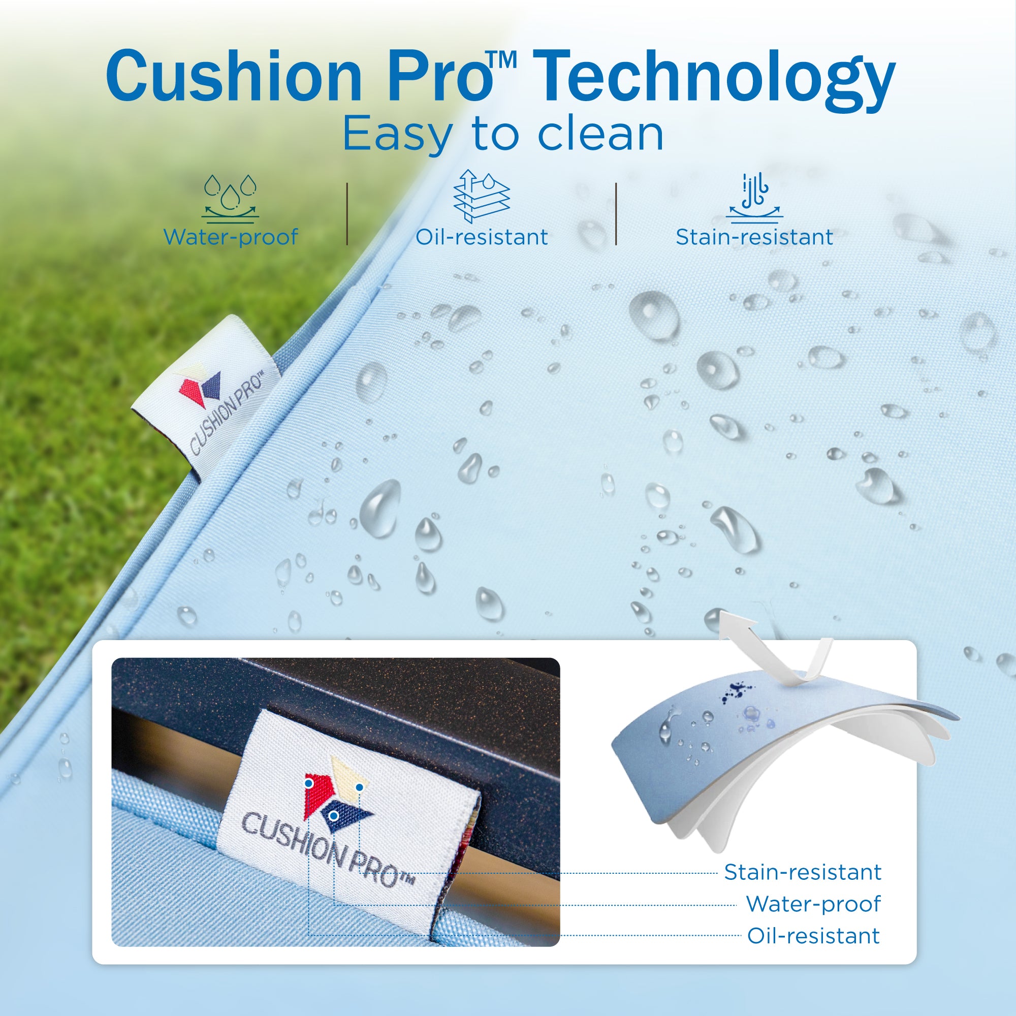 - CushionPro Fabric: Our patented fabric is waterproof, oil-resistant, and stain-resistant, making it easy to clean and ideal for long-term outdoor use.