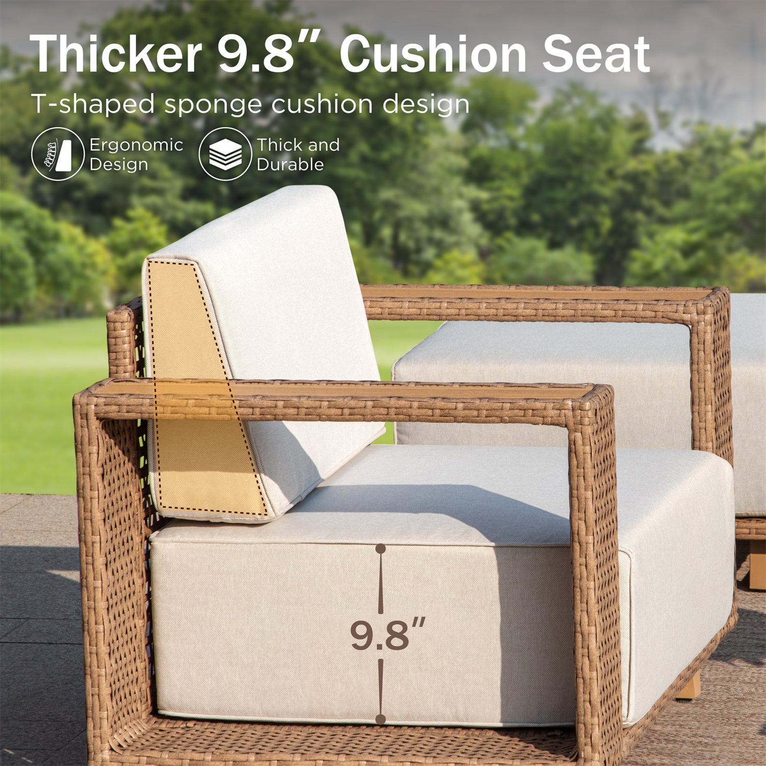 - Supportive Cushions: Featuring innovative T-shaped cushions that offer optimal support and a luxurious feel. The large thicker 9.8” cushion seats ensure that you and your guests will enjoy hours of relaxation.