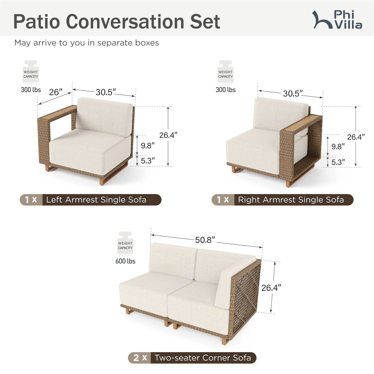 2-seater Corner Sofa: 50.8"W x 26"D x 26.4"H