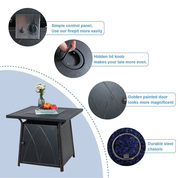 Square Fire Pit Table: 22.5''W x 28.5''D x 25''H