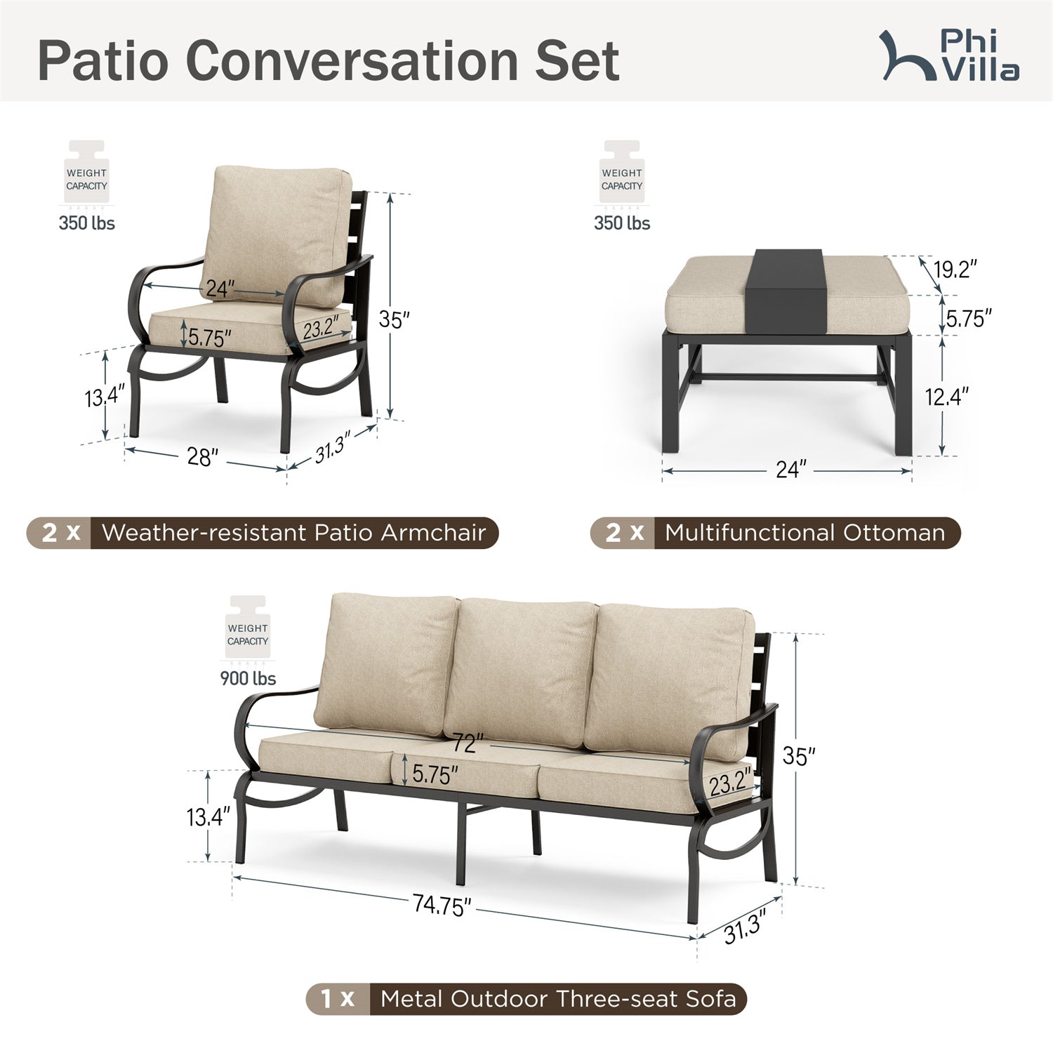 3-Seat Sofa:74.75''W x 31.3''D x 35''H