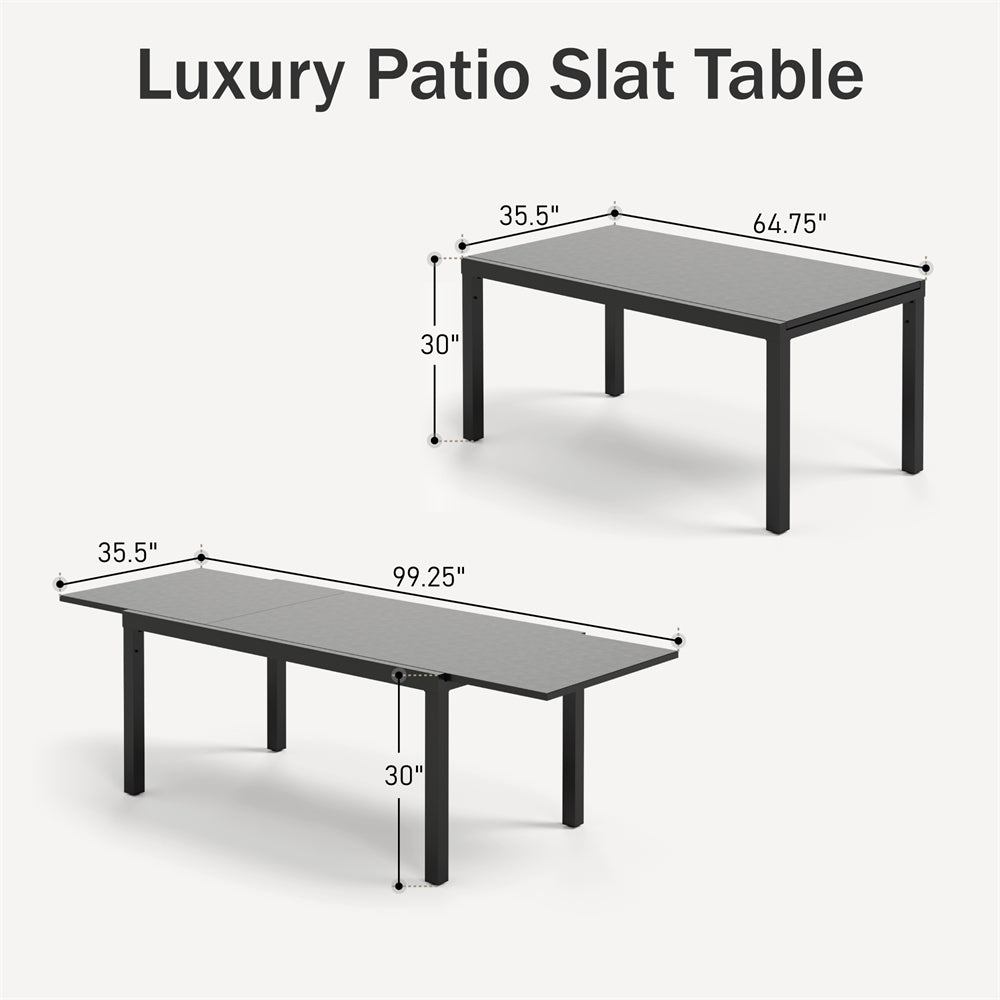- Matt black / wood-grain steel expandable table