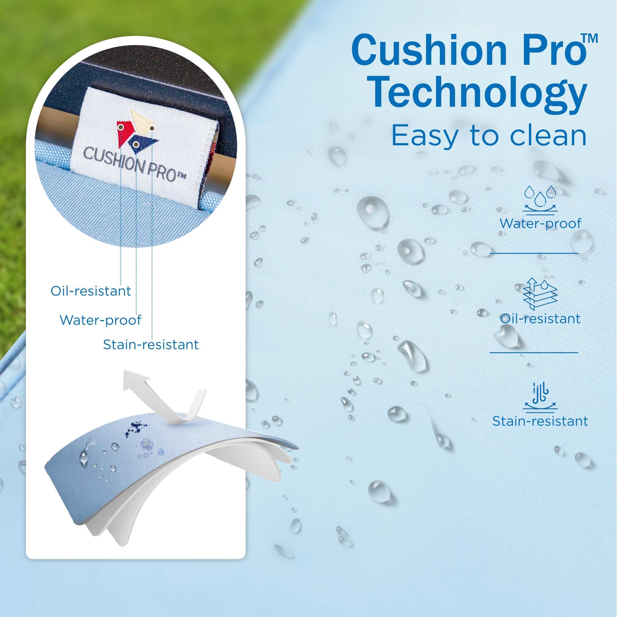 - CushionPro Fabric: Our patented fabric is waterproof, oil-resistant, and stain-resistant, making it easy to clean and ideal for long-term outdoor use.
