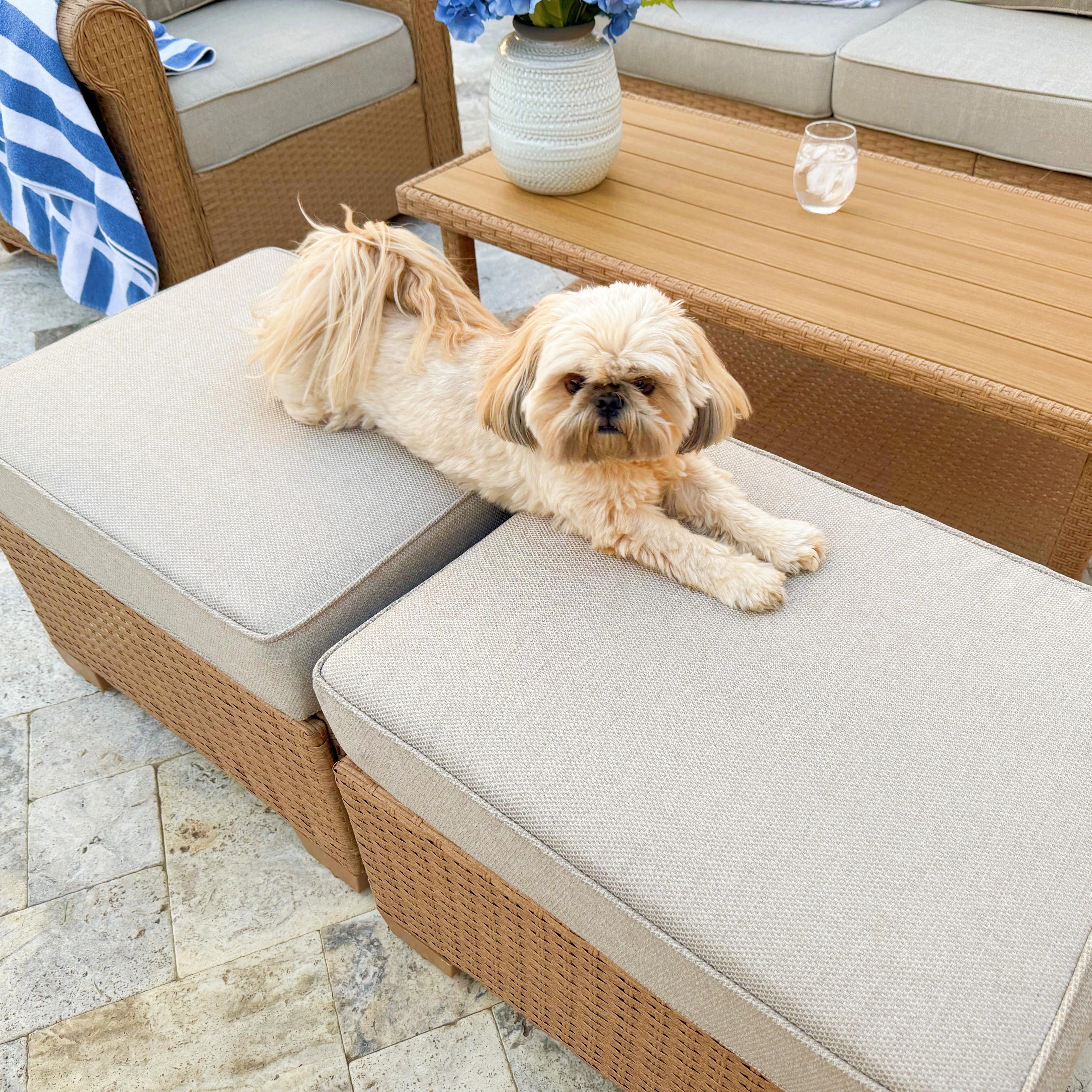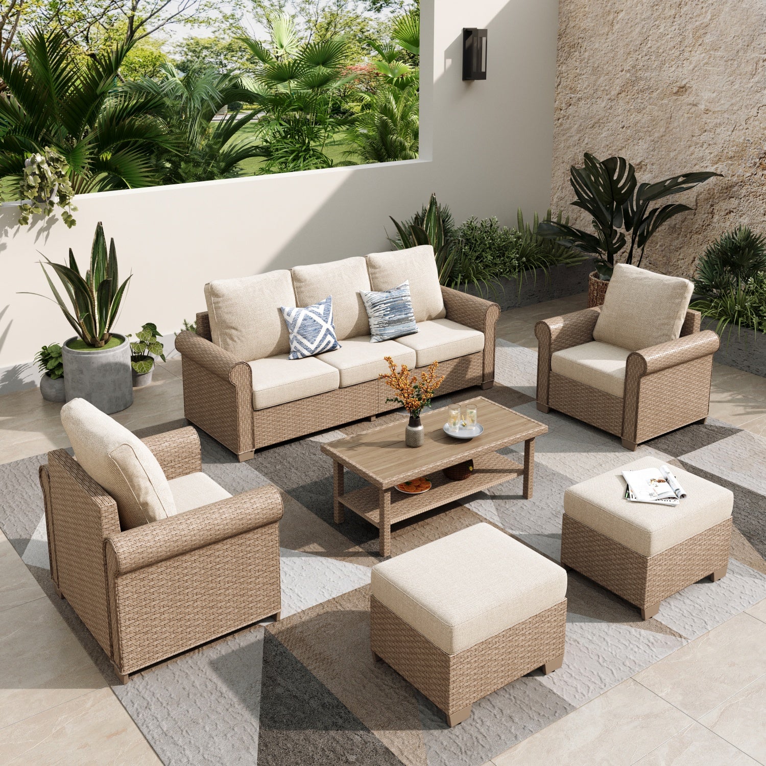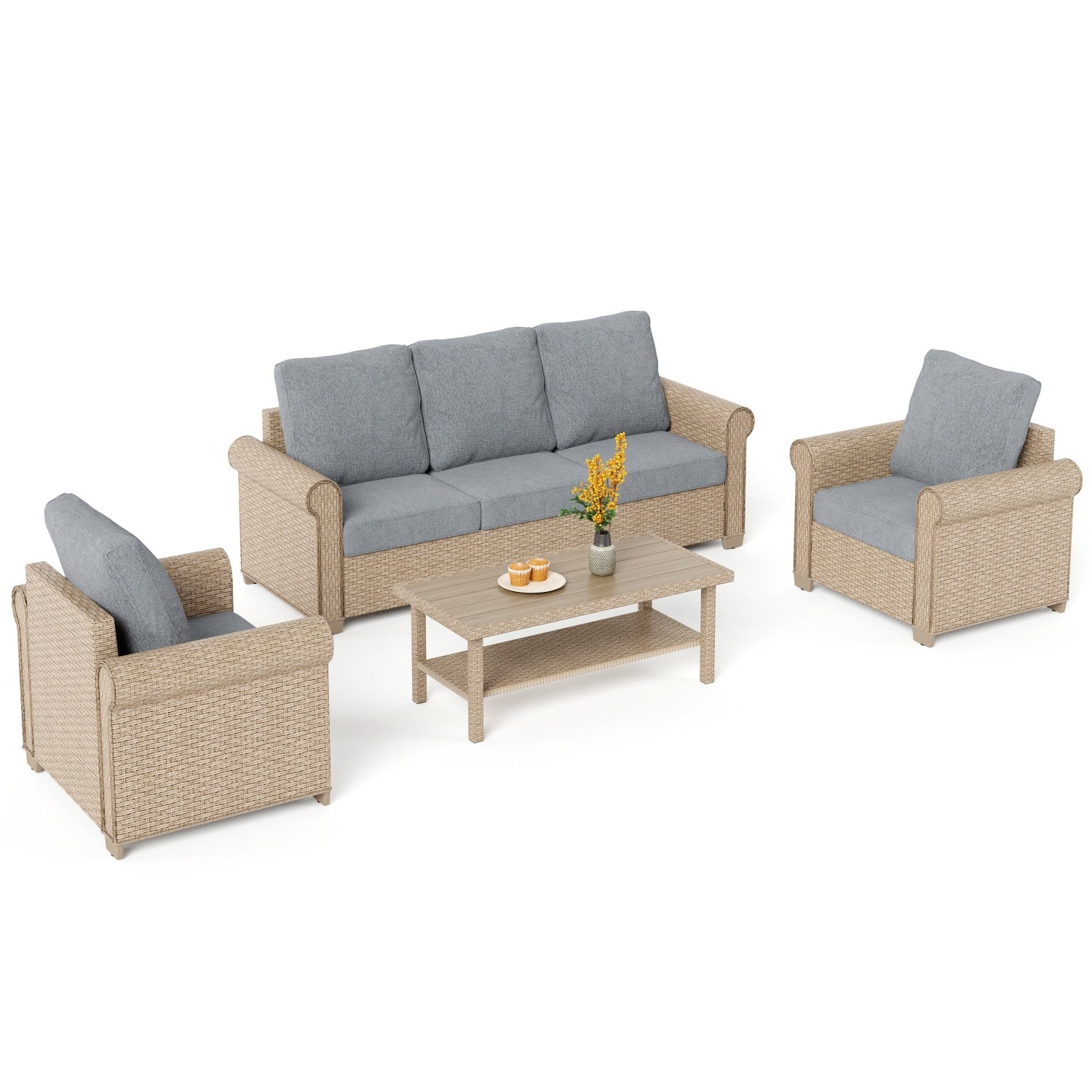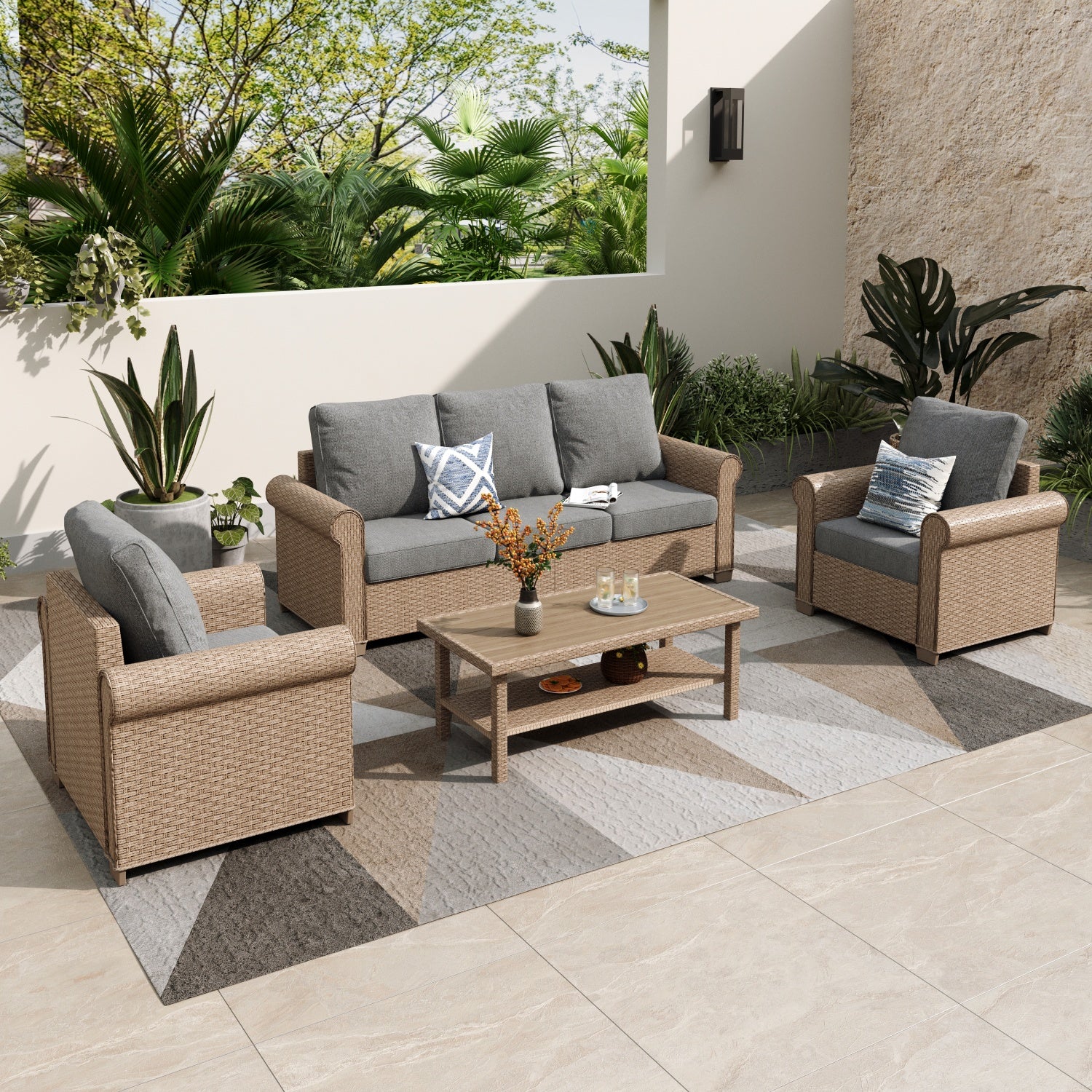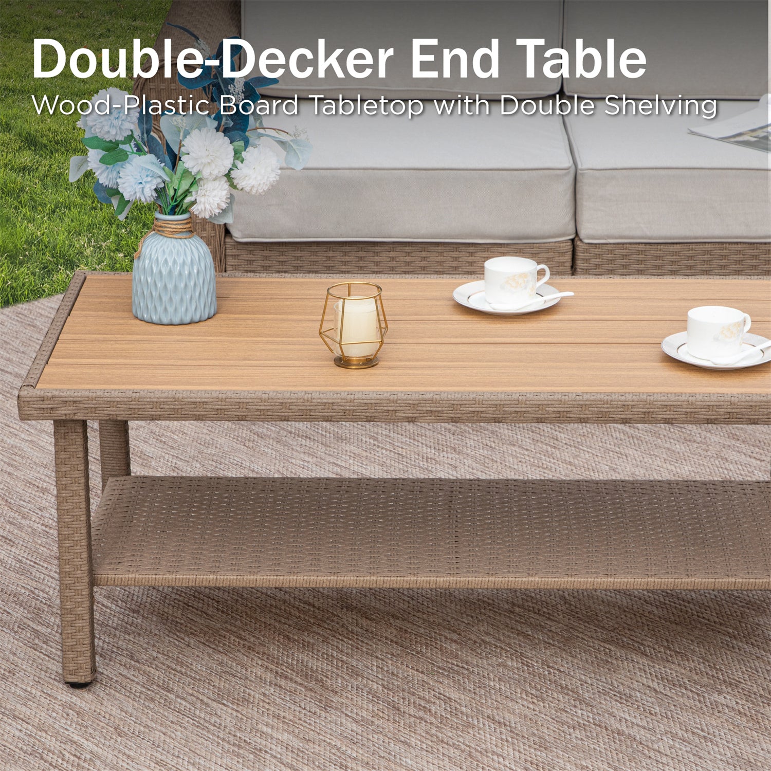 - Double-Shelving Wicker Table: The outdoor sofa features a double-shelving wicker table, providing generous storage space and a sturdy surface, perfectly blending style and durability for outdoor settings.