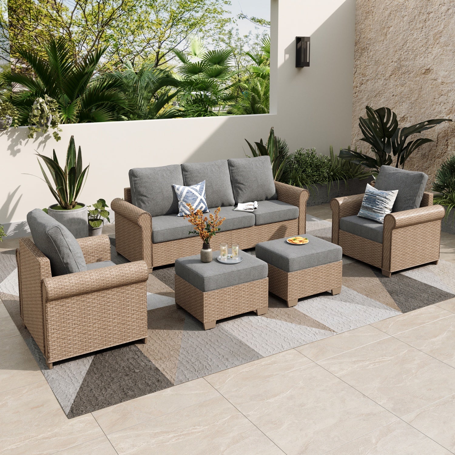 - Premium Design: Experience high-quality design with 5.9’’ widened arched handrails and luxurious three-strand rattan, complemented by 24’’ wide, 5.5’’ thick cushions for relaxation.