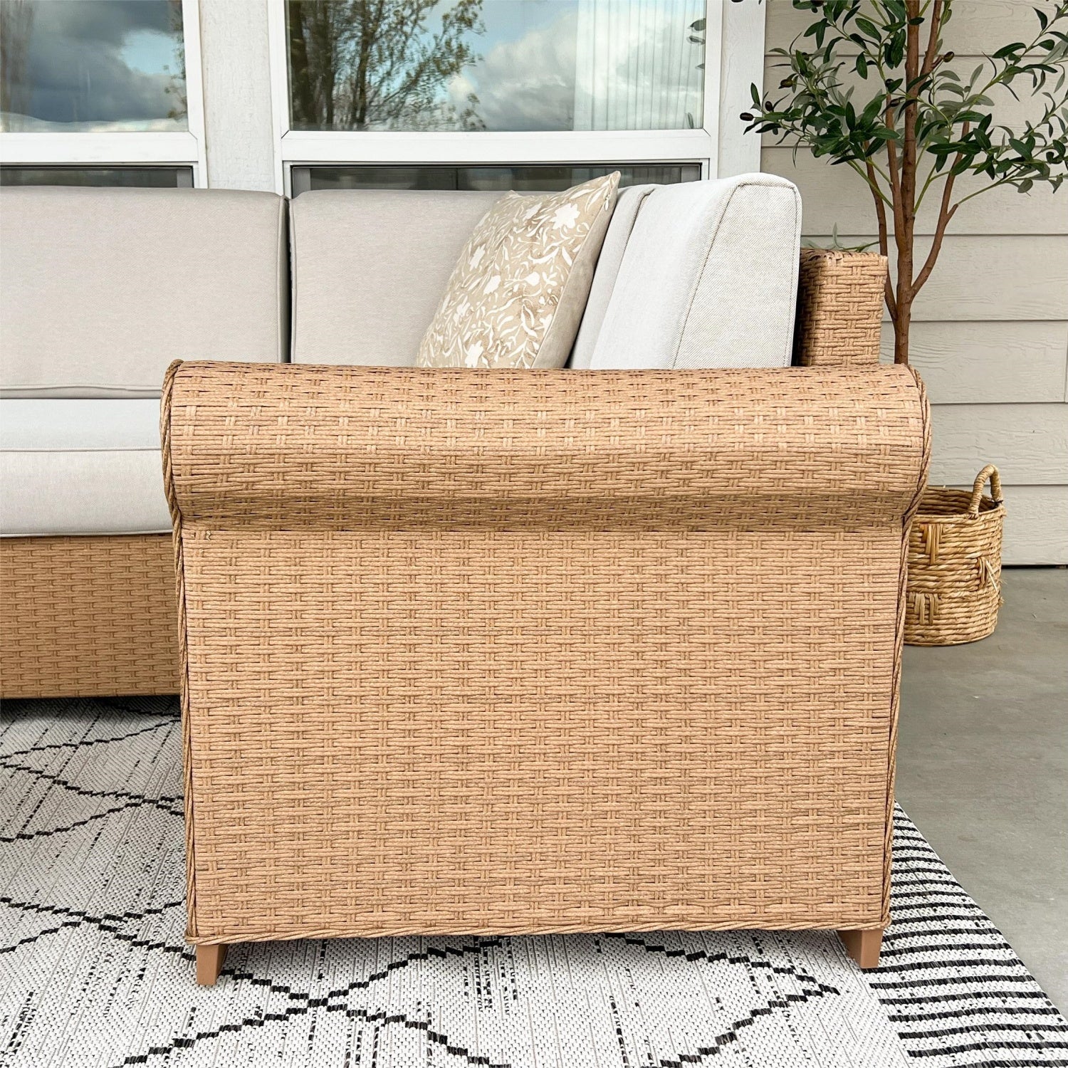 - Premium Design: Experience high-quality design with 5.9’’ widened arched handrails and luxurious three-strand rattan, complemented by 24’’ wide, 5.5’’ thick cushions for relaxation.