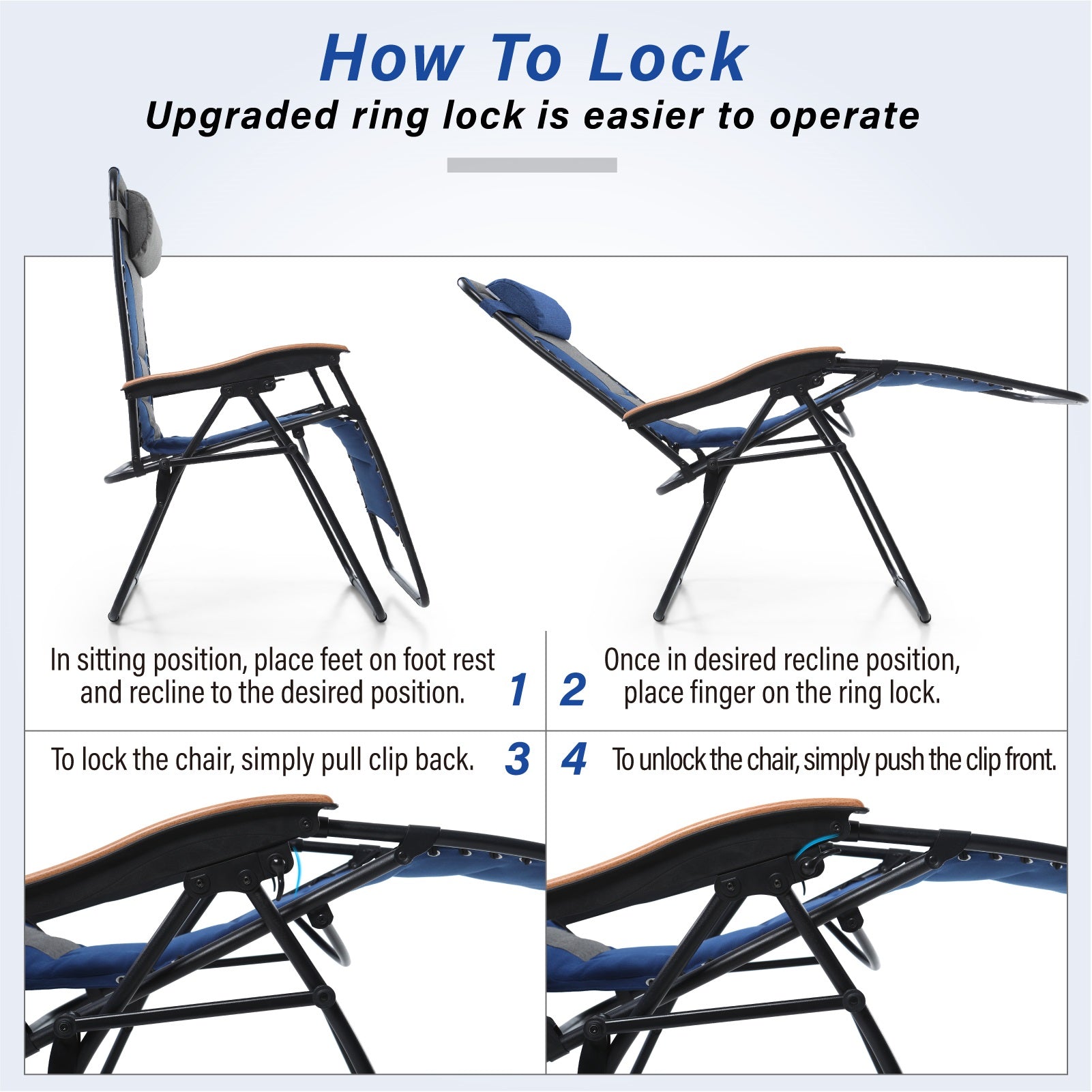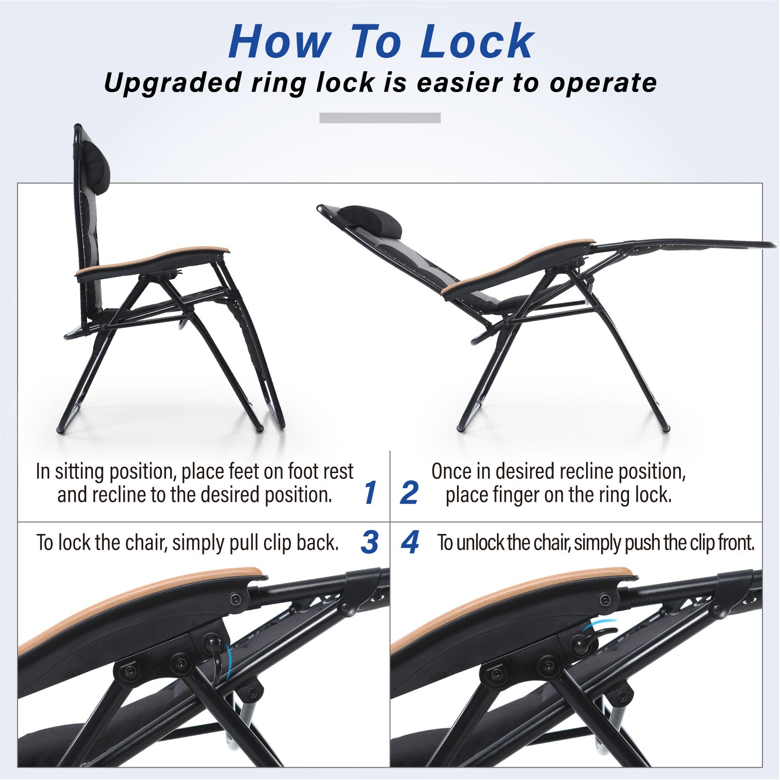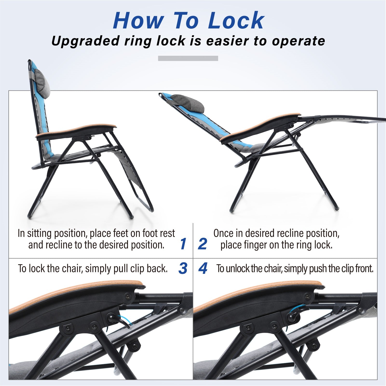 - Adjustable Design: This chair is designed with a lockable recliner system, a simple locking lever can adjust and lock the oversized zero gravity chair into any position from upright to fully reclined, pull the clip back to secure and push the clip forward to unlock, you can easily adjust the back of the chair to any position you like.