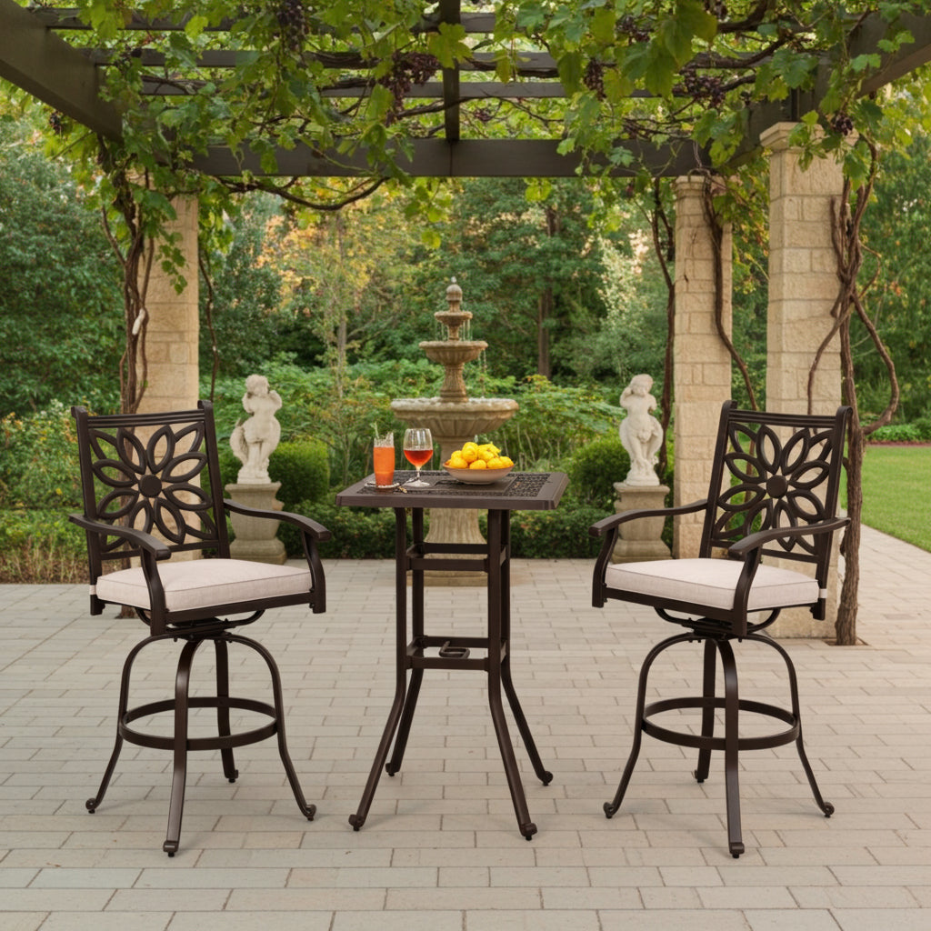 3-Piece Cast Aluminum Square Table & 2 Patio High Swivel Bar Stools Chairs Set