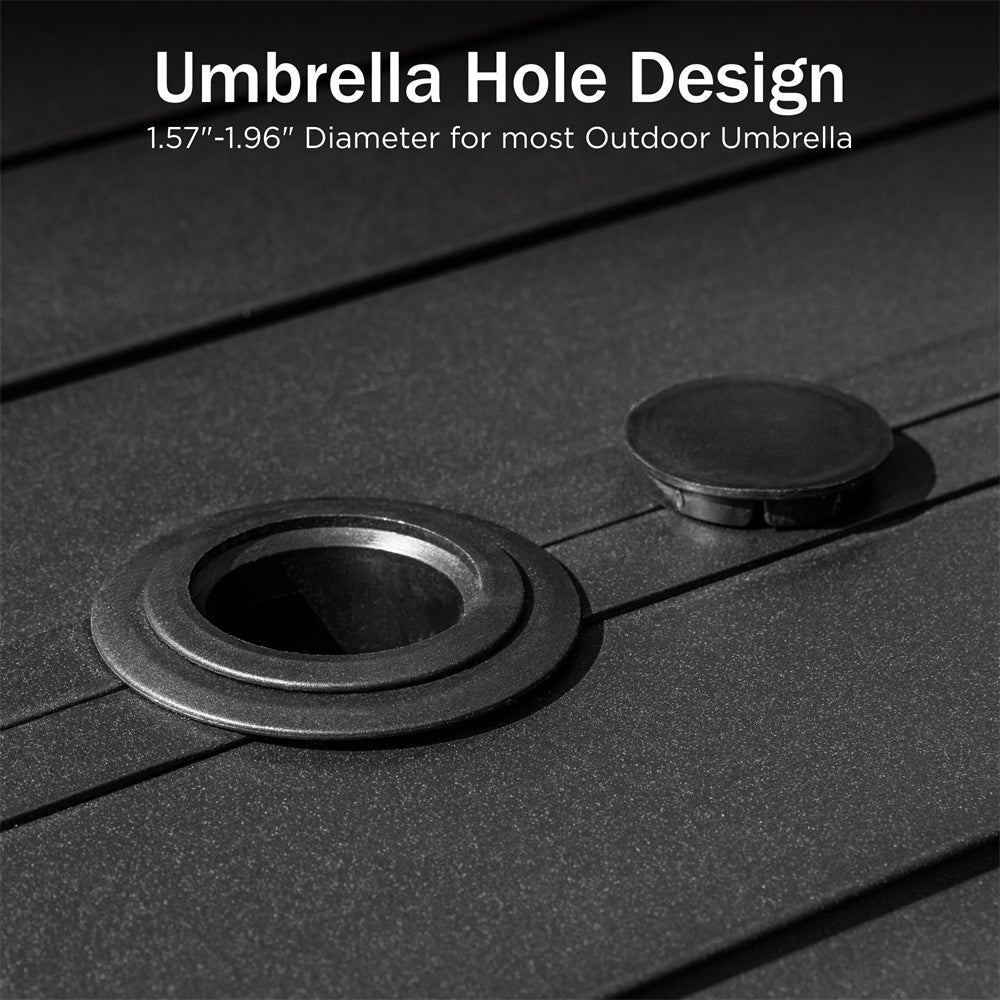 Table: L 67" x W 35" x H 40"; Diameter of umbrella hole: 1.57"