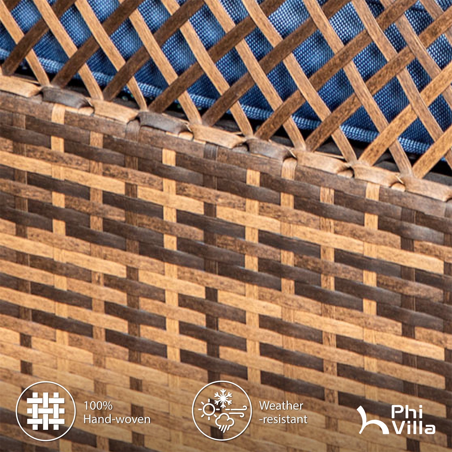 - Material: Powder-coated stable steel frame, rust, and weather-resistant. All weather-resistant PE wicker. Quick-drying deep seat cushions are covered in high-performance spun polyester fabric that allows for superior durability and colorfastness in all types of outdoor settings. Padded cushions with removable covers allow for easy cleaning. A stable and breakage-proof tempered glass tabletop.